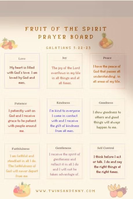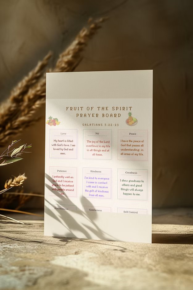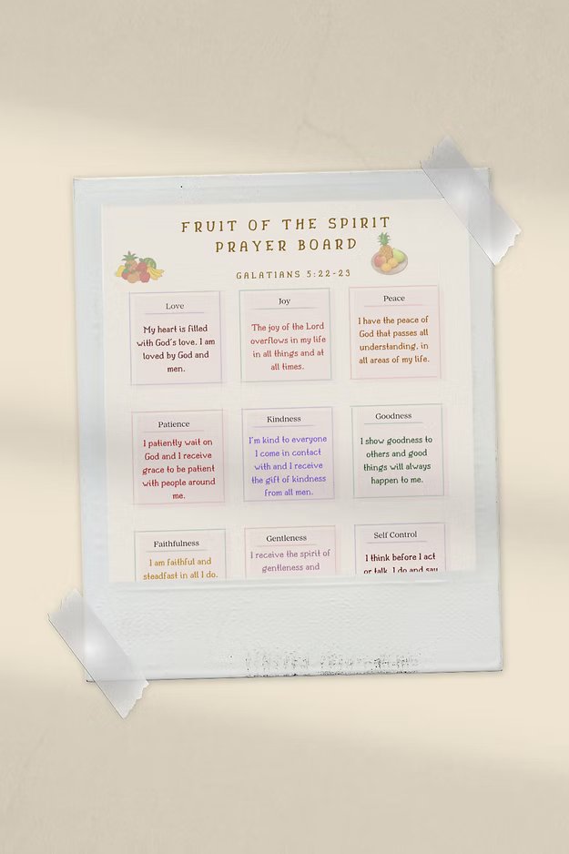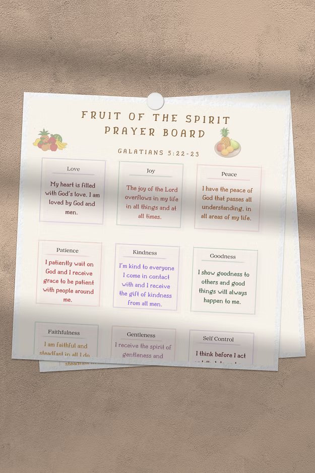 Set the tone of the day for your family with the Fruit of the Spirit Prayer Board. Download, print, and display it anywhere. This board features declarations inspired by the 9 fruit of the spirit in the Bible. Encourage daily self-declarations for both children and adults, to replace negative emotions with love, joy, and peace, fostering a godly home environment.